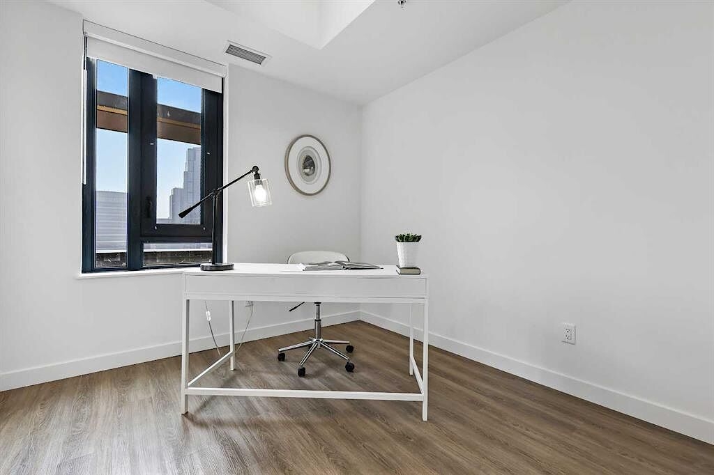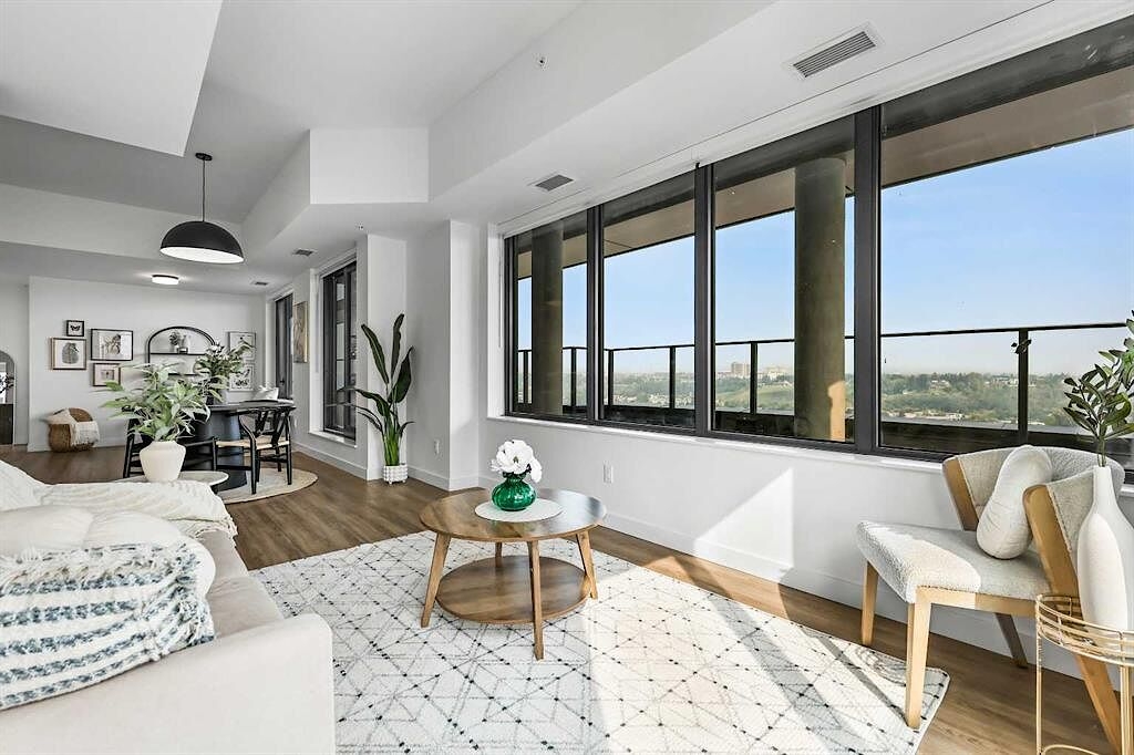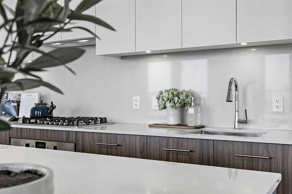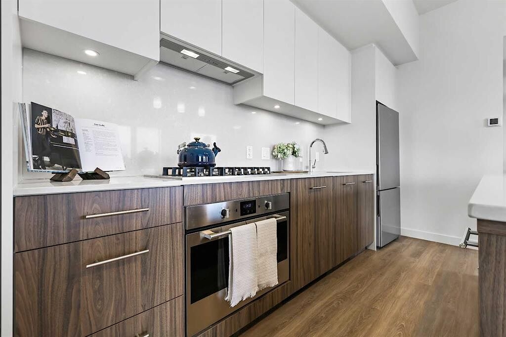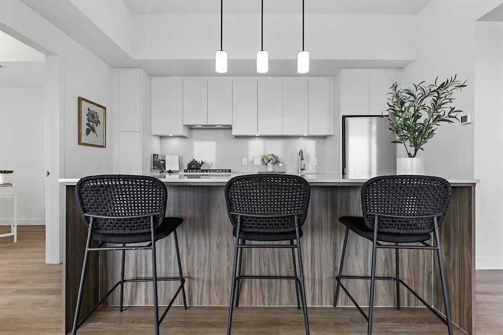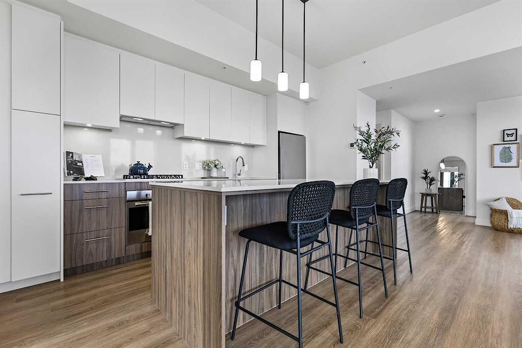 The bright open-concept layout is framed by expansive windows that flood the home with natural light, highlighting warm neutral tones and luxury wood-plank vinyl flooring throughout. At the heart of the home is a European-inspired kitchencomplete with premium integrated appliances, quartz countertops, a breakfast island, and sleek contemporary cabinetry—ideal for both everyday living and entertaining.