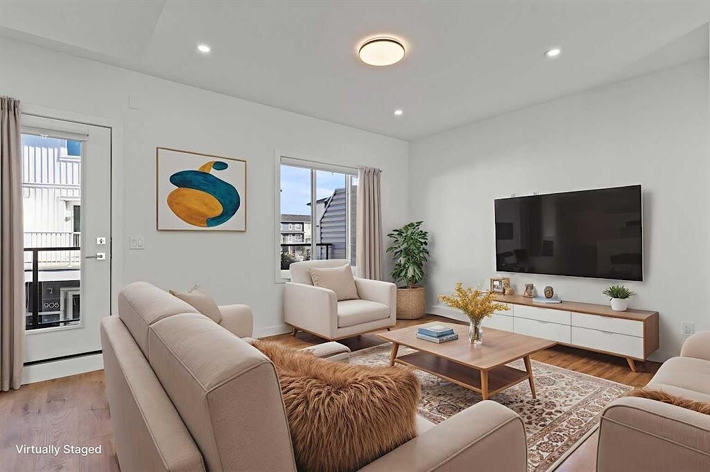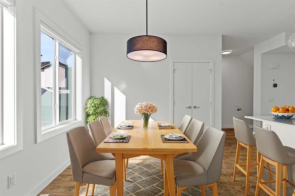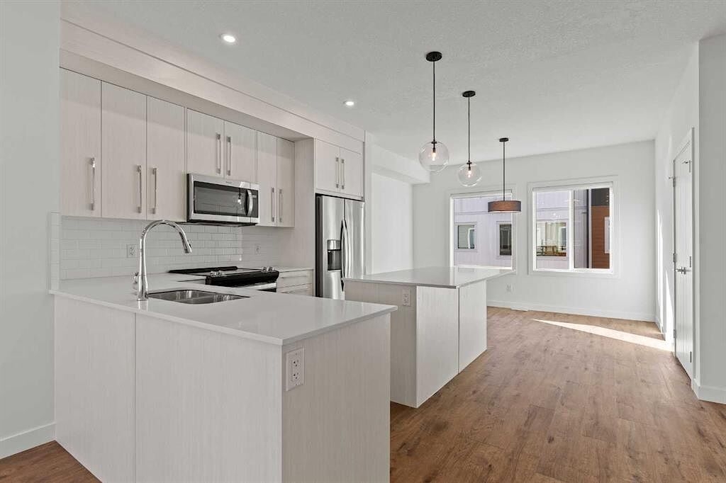 The open-concept main floor features a chef-inspired kitchen with quartz countertops, stainless steel appliances, custom cabinetry, and a large island that flows seamlessly into the living and dining areas — perfect for entertaining. Contemporary finishes, luxury vinyl plank flooring, and in-suite laundry complete the interior.