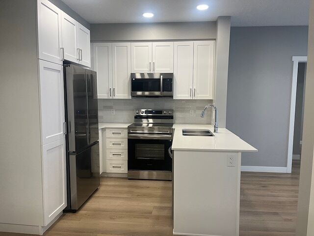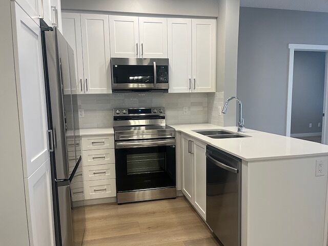Modern kitchen with stainless steel appliances and quartz countertops