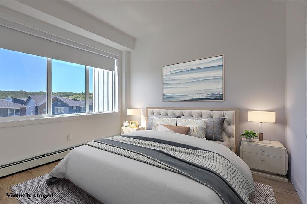 This bright, open-concept unit features a contemporary kitchen, spacious living area, and large windows that fill the space with natural light. The primary bedroom includes a walk-through closet and private ensuite, while the second bedroom and full bathroom are ideal for a roommate, children, or a home office. Step out onto your private balcony to enjoy summer evenings, with select homes overlooking a serene protected pond and beautifully landscaped green space.